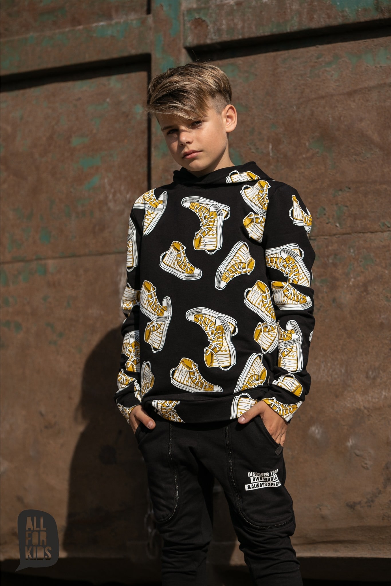 Dzianinowa bluza z kapturem w TRAMPKOWY wzór w kolorze czarnym.