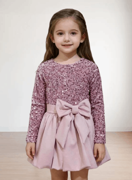Efektowna Pudrowa Sukienka Dziewczęca: Cekiny i Satynowa Kokarda!