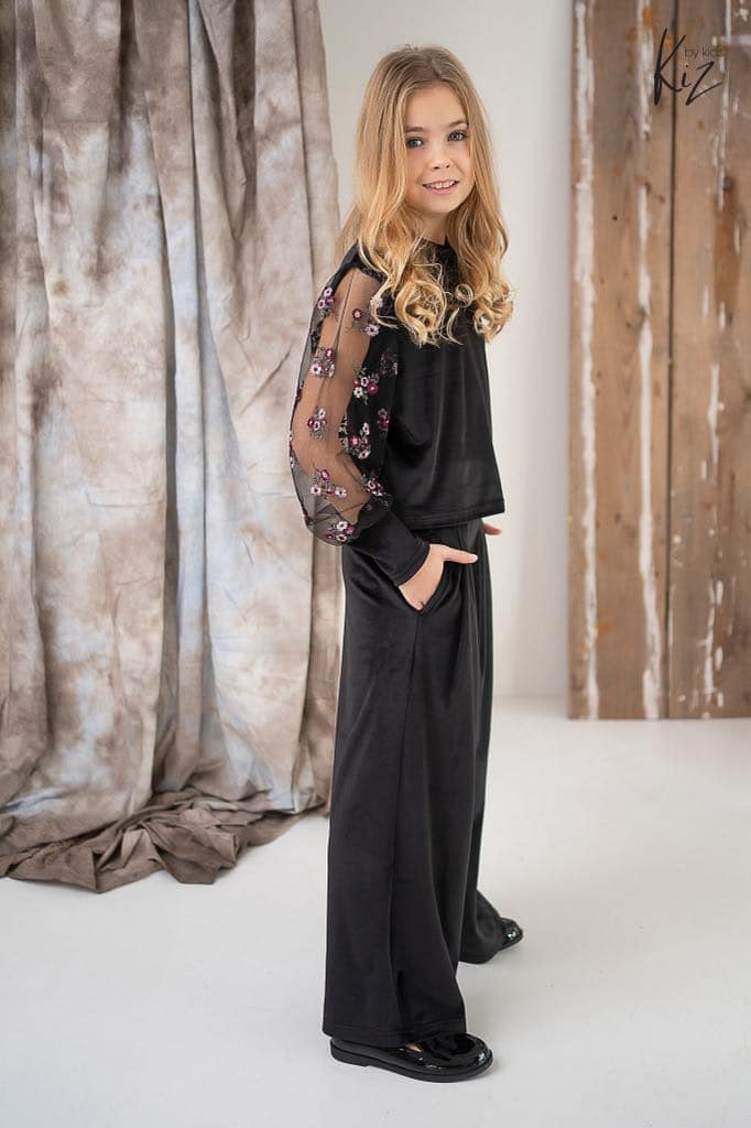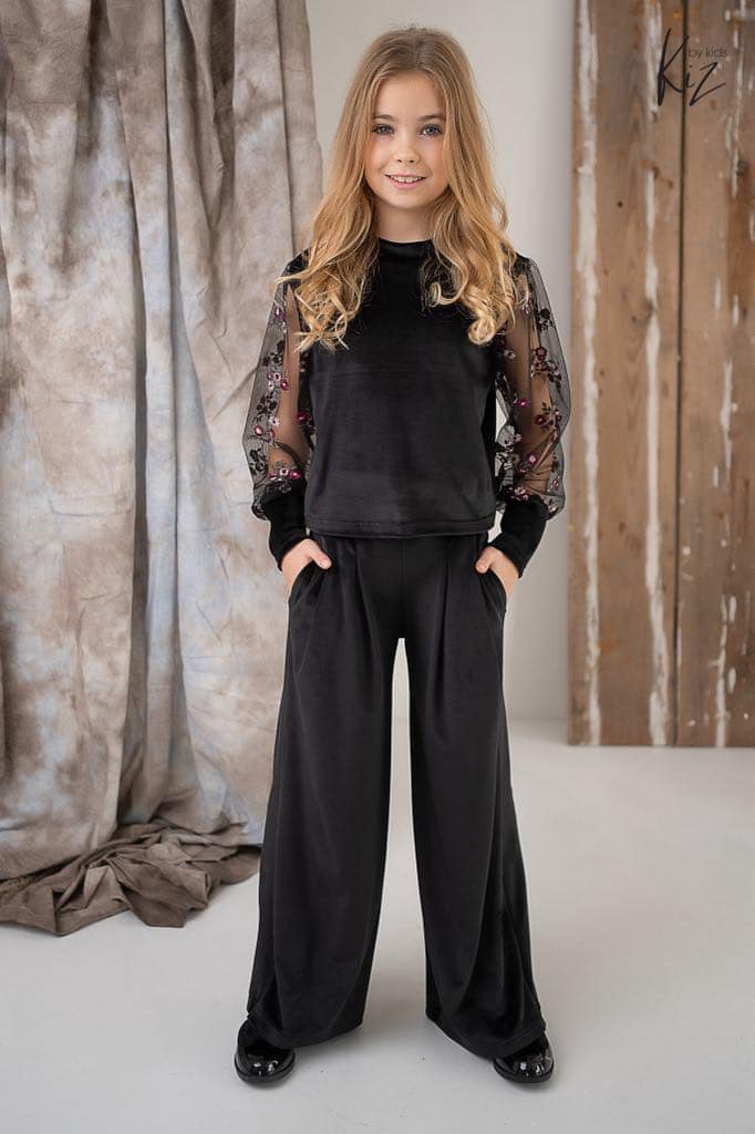 - BLUZKA/ BLUZA WELUR Z RĘKAWAMI Z TIULU A NA NICH KWIATUSZKI HAFOTWANE; WYKOŃCZONE ŚCIĄGACZEM Z WELURU