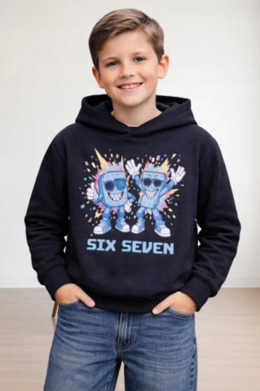 - Nadruk: Duża, kolorowa grafika z dwoma kreskówkowymi postaciami z napisem „SIX SEVEN” na piersi.
