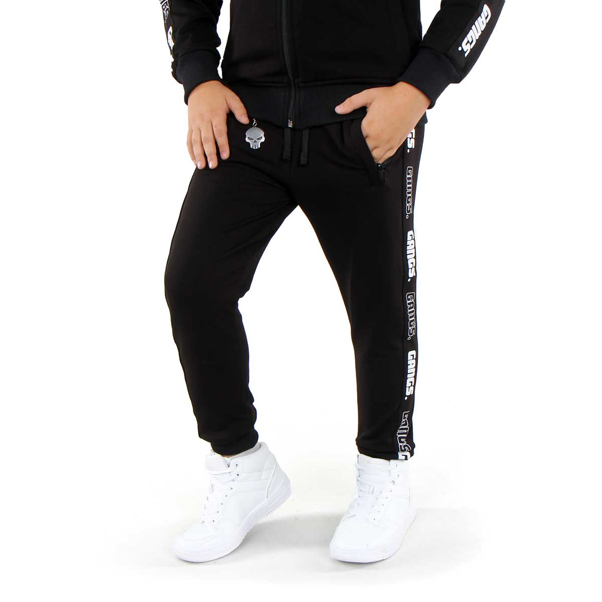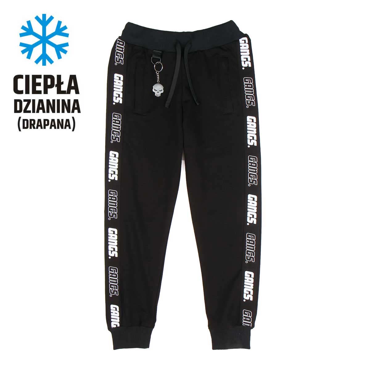 Spodnie dresowe TAŚMA GANGS CNC* CIEPŁE. (Dzianina drapana MIŚ 300 gram). Spodnie posiadają dwie duże kieszenie zapinane na zamek, które pomieszczą spory smartfon. Po obu stronach nogawek znajduje się lampas wykonany techniką sitodruku. Elastyczna guma w pasie oraz rozciągliwa dzianina zapewniają szeroki zakres rozmiarów, dzięki czemu spodnie idealnie nadają się również dla dzieci o grubszej kości. Do spodni dołączony jest metalowy, firmowy brelok CZASZKA.