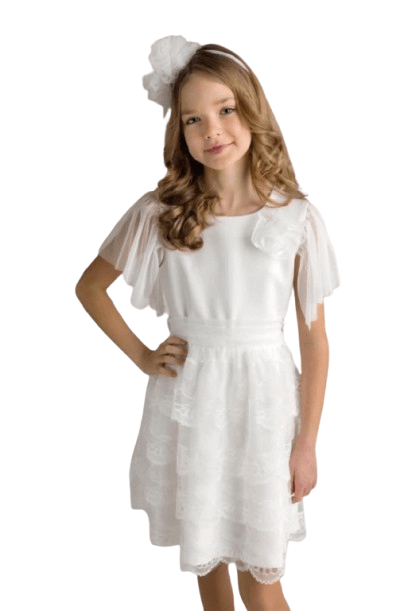 - PRZÓD GÓRA GŁADKA Z KWIATKIEM NA BOKU PRZYSZYTYM Z TIULU KORONKOWEGO ( MATERIAŁ TYPU FIRANKA 🙂 )