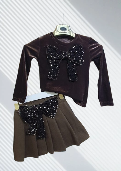 Elegancki Zestaw Aksamitny dla Dziewczynki: Bluzka + Spódniczka z Cekinowymi Kokardami